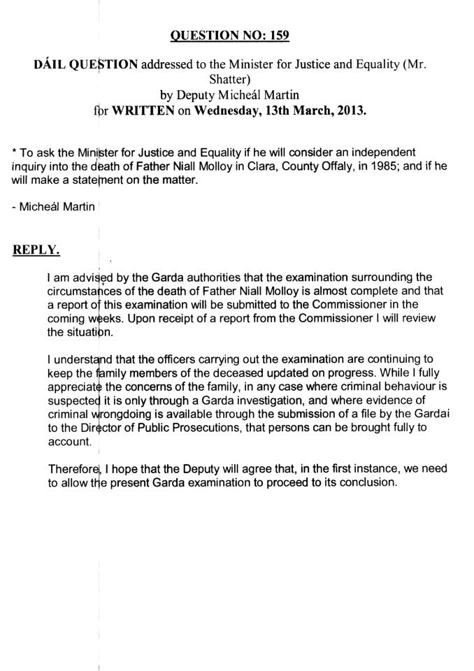 8. To ask the Minister for Justice and Equality if he will instigate a public inquiry into the death of Father Niall Molloy. [20854/13]