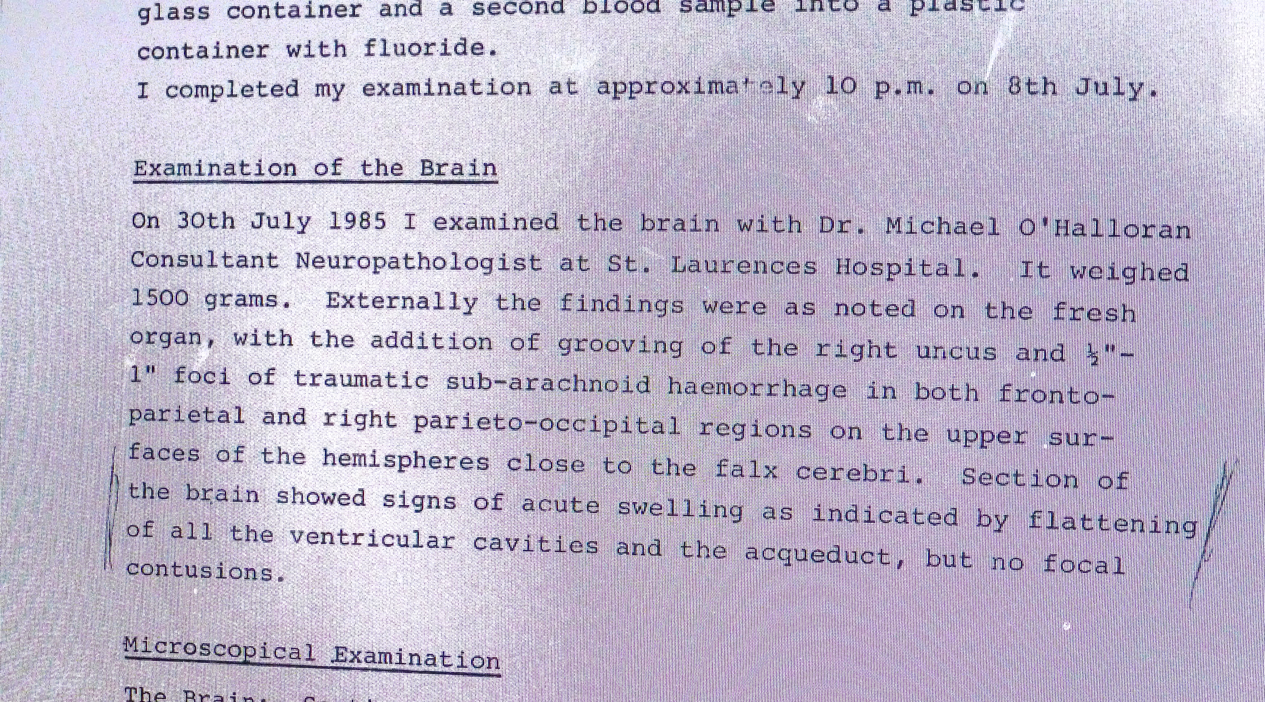 ” On 30th. July I examined the brain with Dr. Michael O’Halloran Consultant Neuropathologist at St Laurences Hospital.”