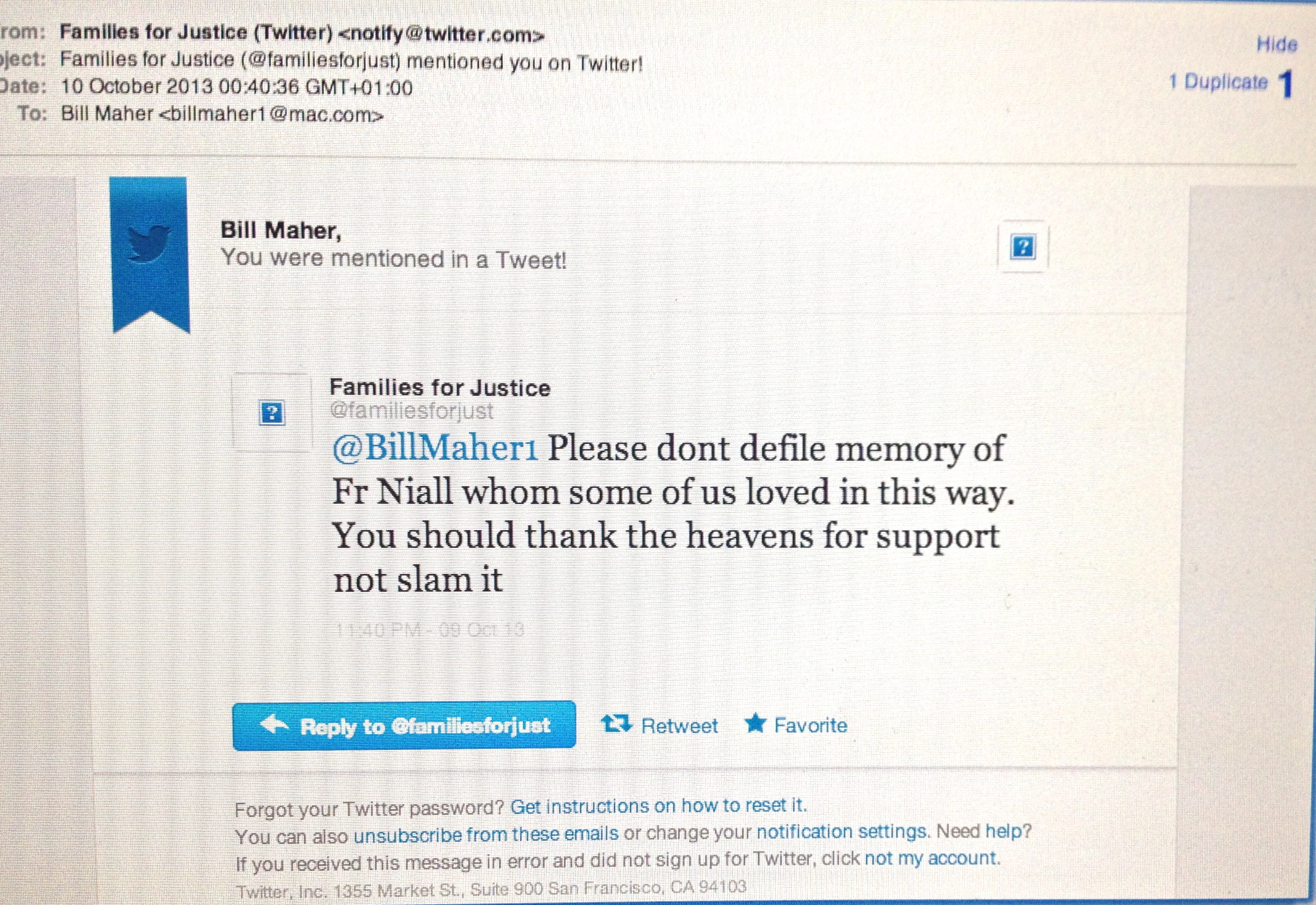 Some months ago this post was put on Twitter aimed directly at me by a group using the name Families for Justice @familiesforjust. They removed the offensive tweet after other people objected to it. I asked for the names of the people behind the group but to date they have not identified themselves.