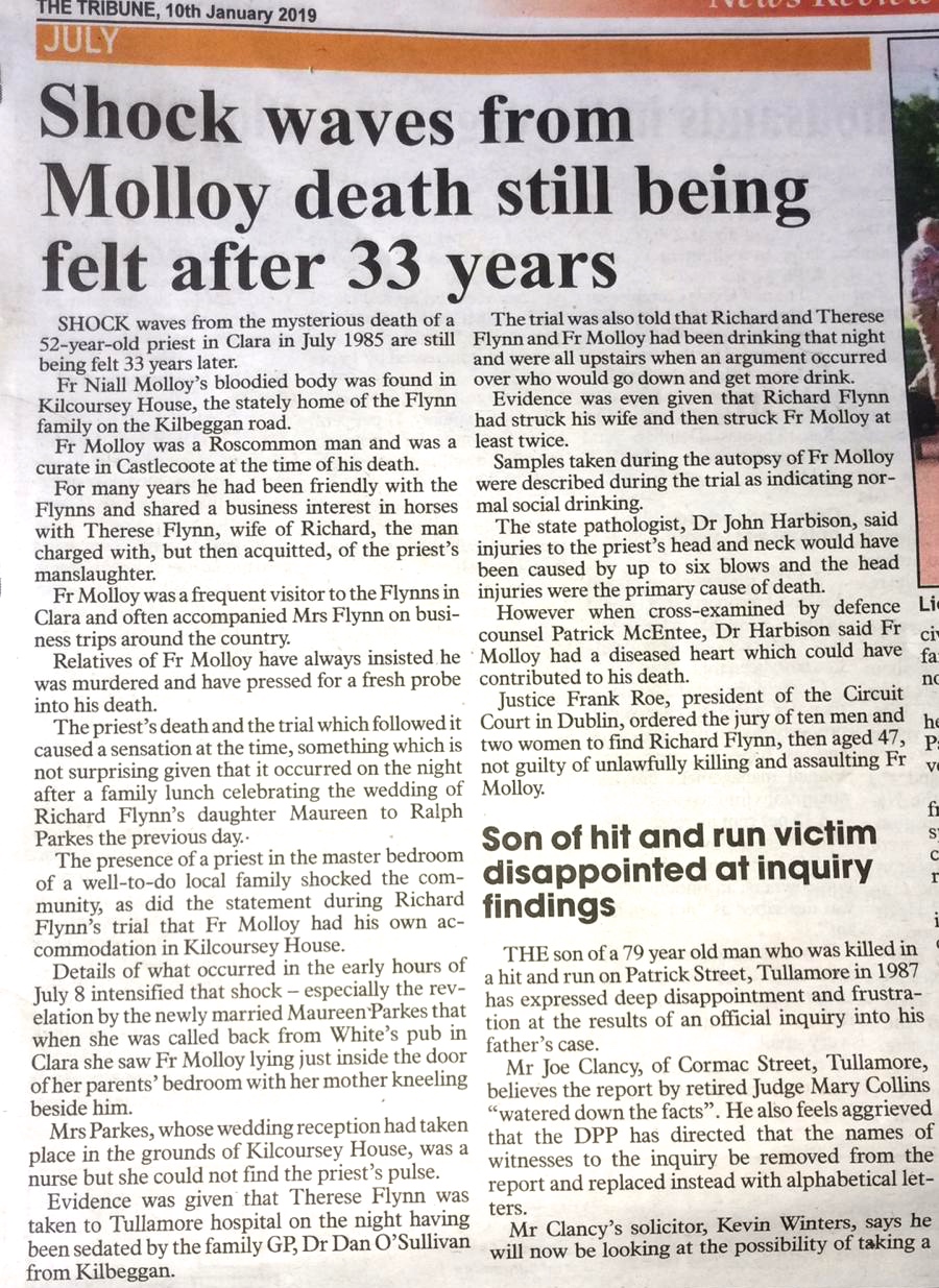 Shock waves from Molloy death still being felt after 33 years – Tullamore Tribune 10th Jan. 2019
