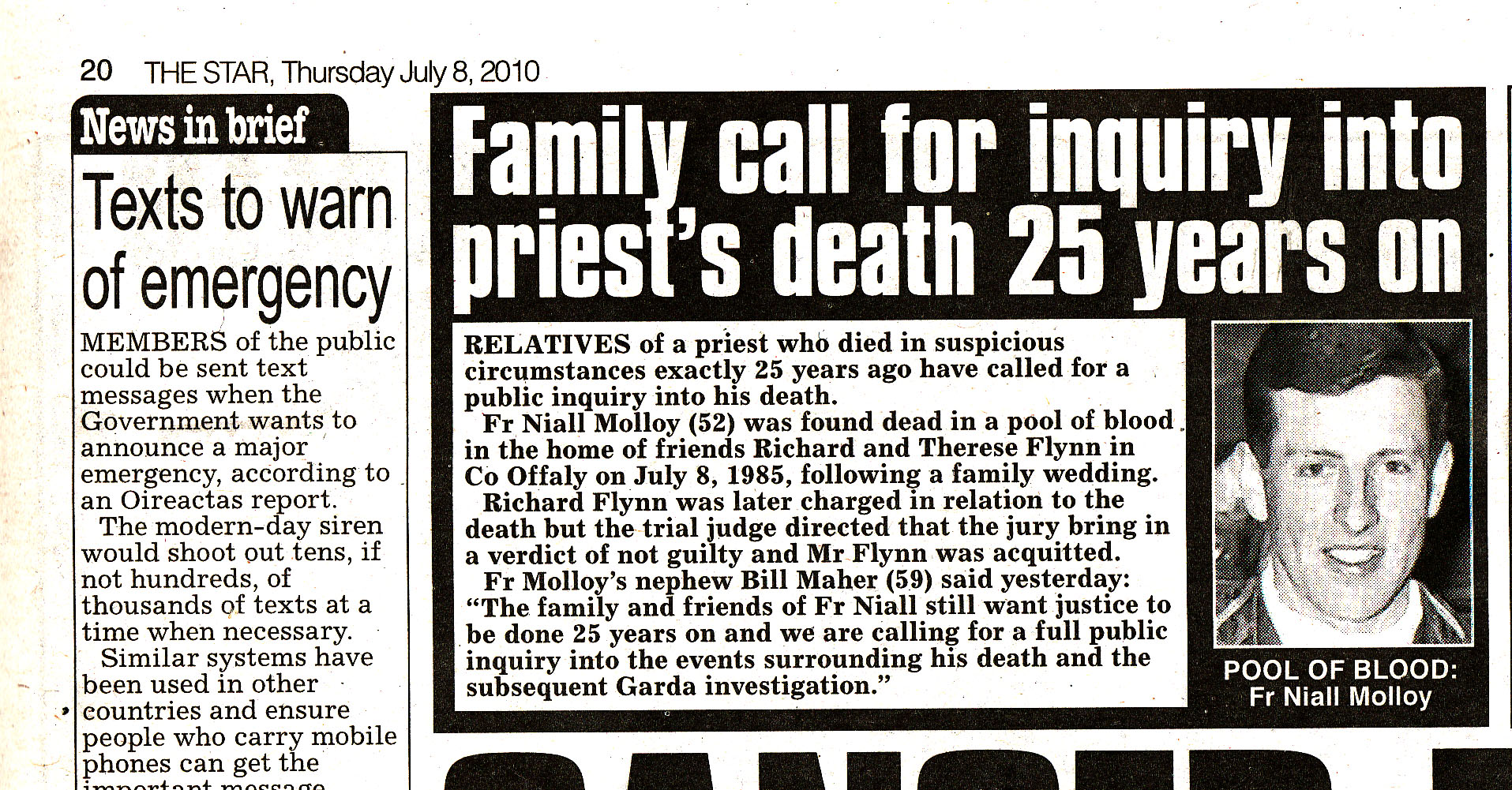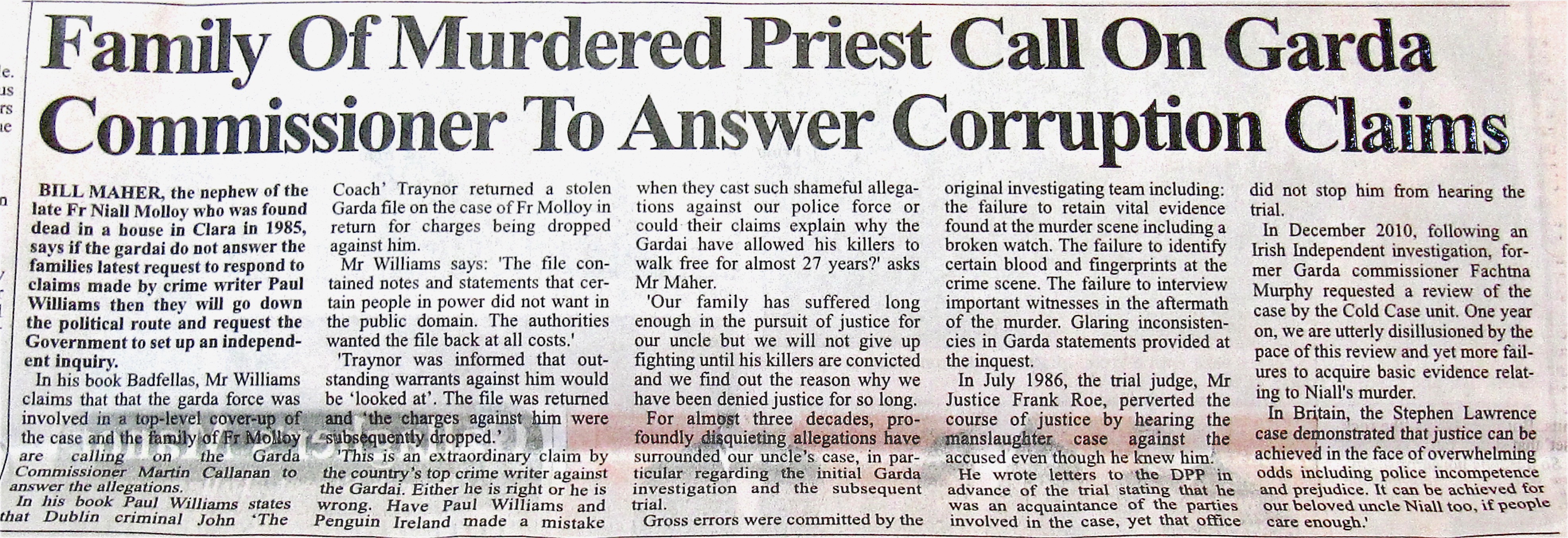 http://www.independent.ie/irish-news/dail-committee-suspended-over-questions-about-murdered-priest-fr-niall-molloy-28904125.html , ( 21 November 2012)