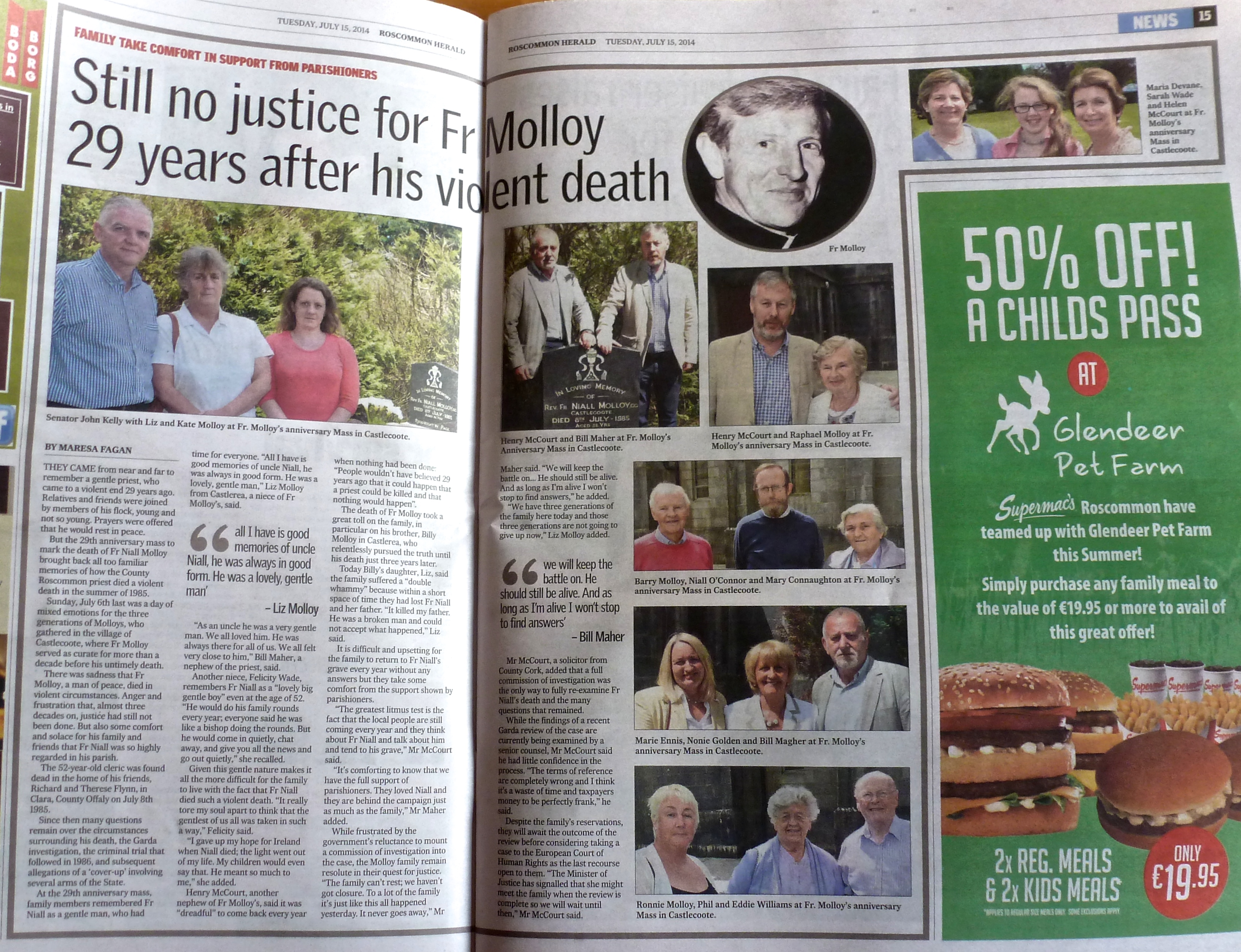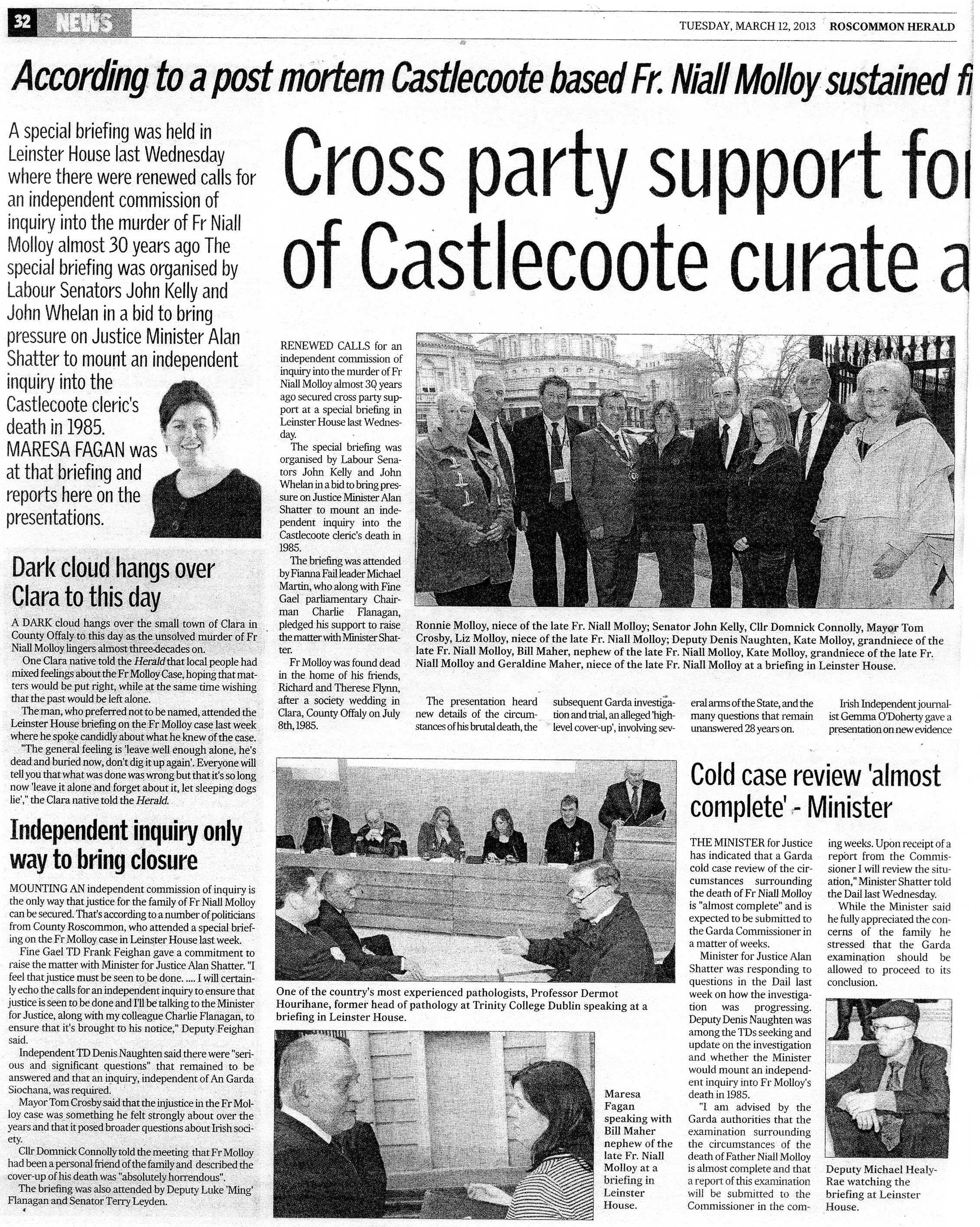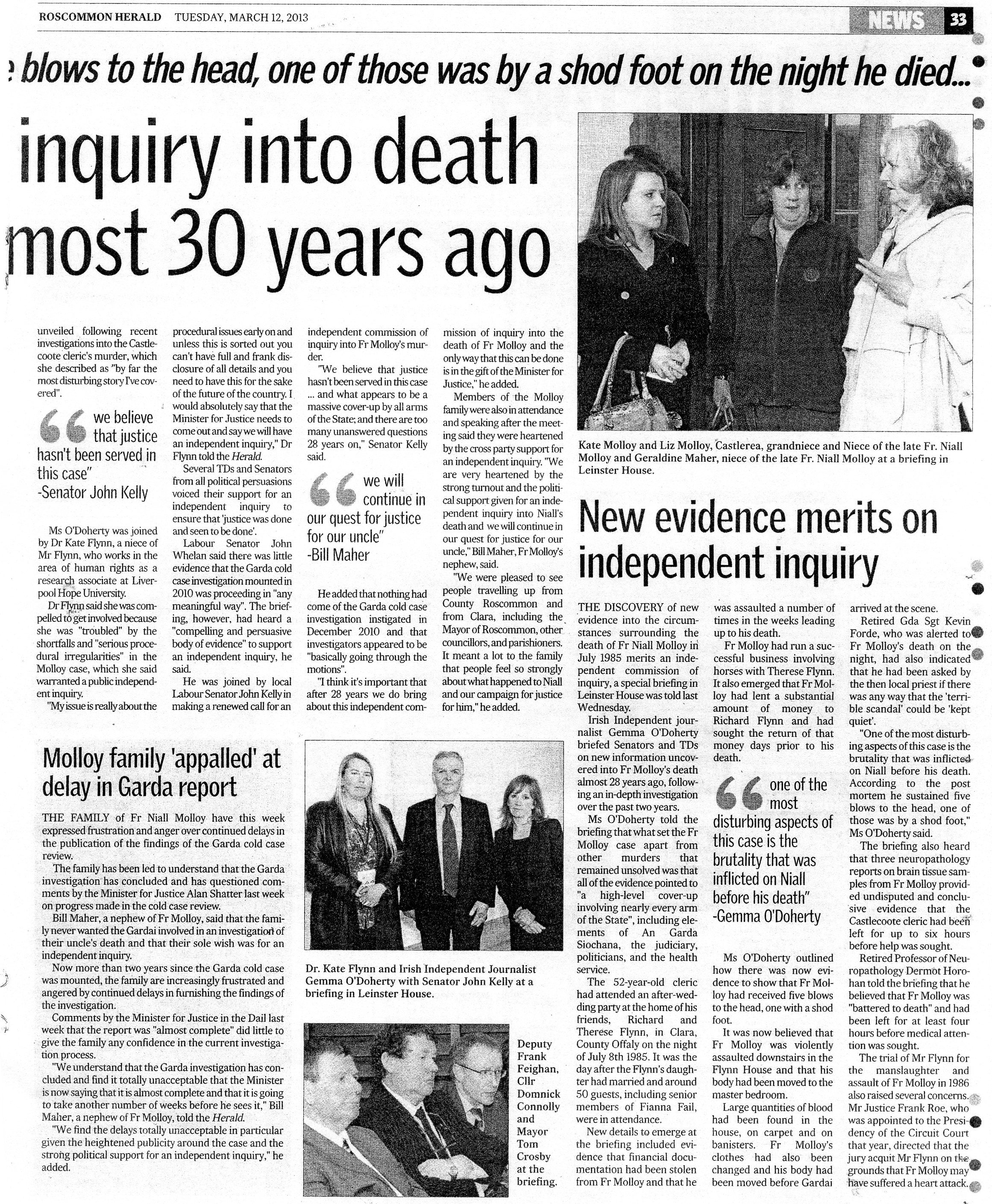 Justice Minister must honour promise of inquiry into Fr Molloy death – Kelly ” Roscommon Herald ( 20 November 2012 )